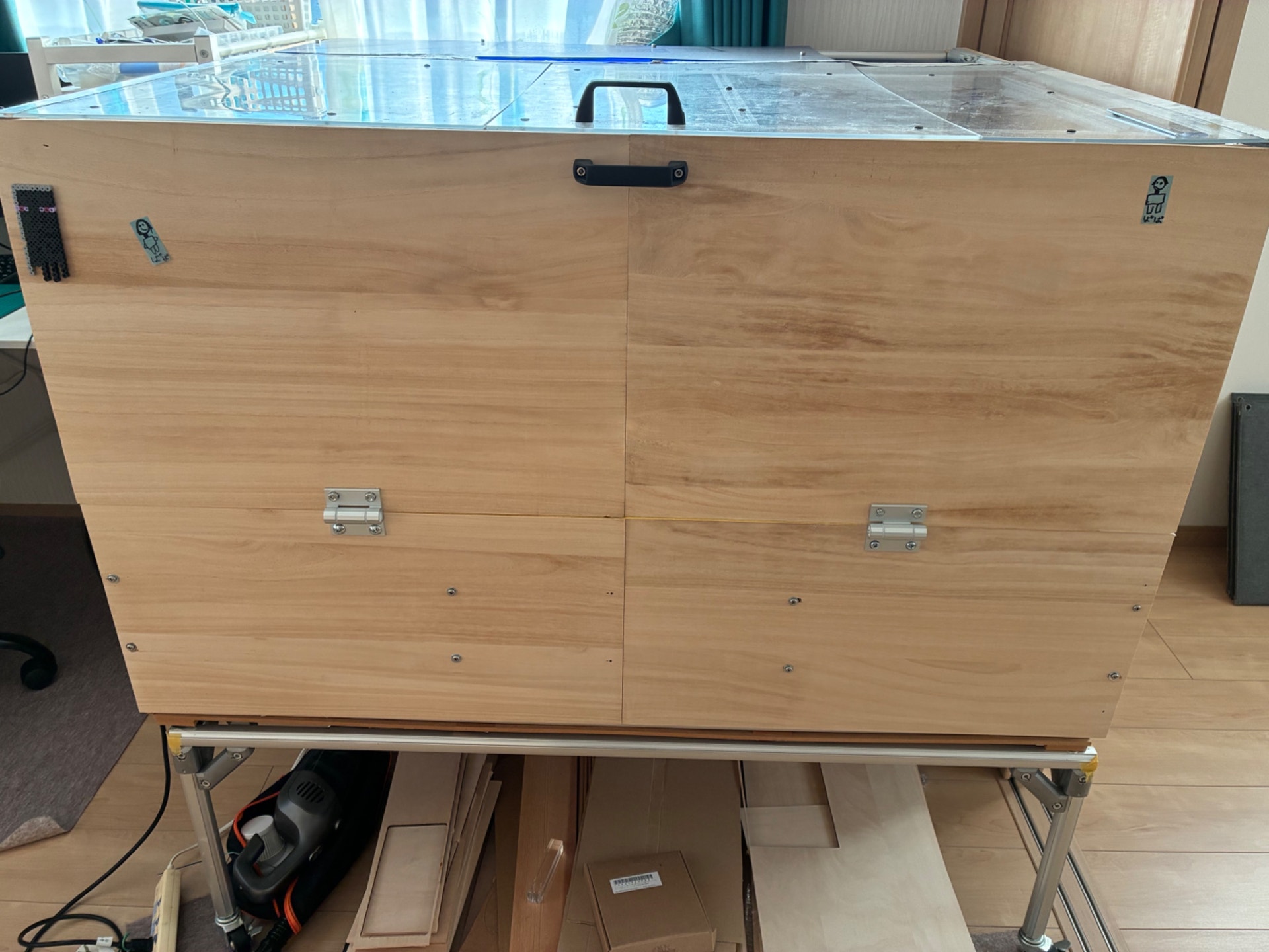 レーザー発振器や電気部品は中国から輸入し、ボディはホームセンターで買ったアルミフレームや木材で作りました。電気配線は自分で設計。