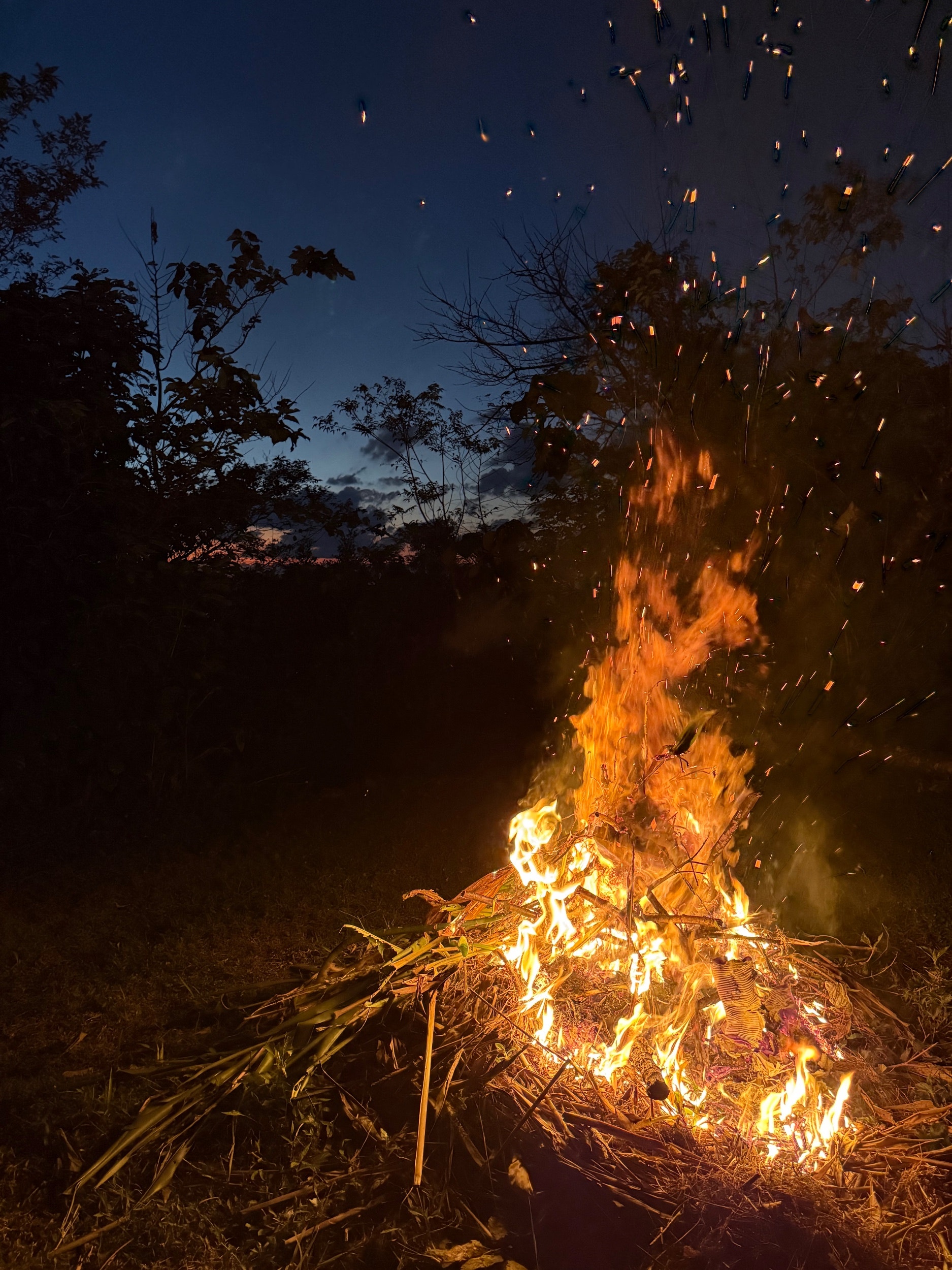 日が暮れてから、庭で焚き火 を。炎がパチパチと音を立てて燃えるのを 見ていると、心の中のネガティブな感情が燃え尽きていくようです。